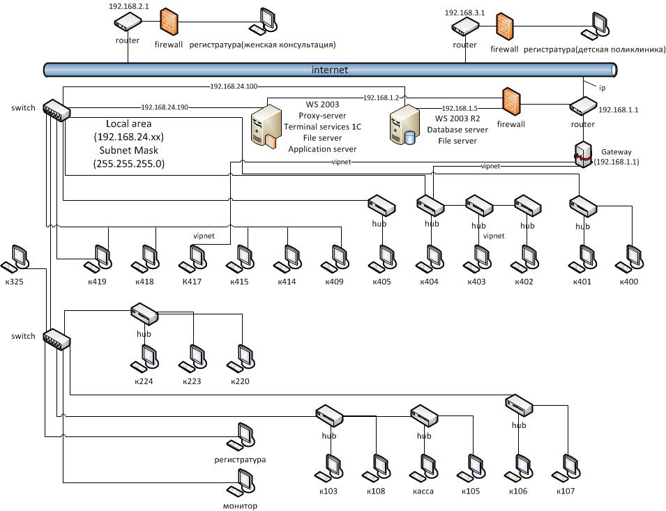 1.ОС - WinServer 2003, выступает в качестве прокси сервера (стоит usergate), терминальный сервер (для 1с), так же инэт подымается на модэме, на сервере 2е сетевые карты - 1.LAN - 192.168.24.190.2.Wan - 192.168.1.3 (со шлюзом на модем - 192.168.1.1)